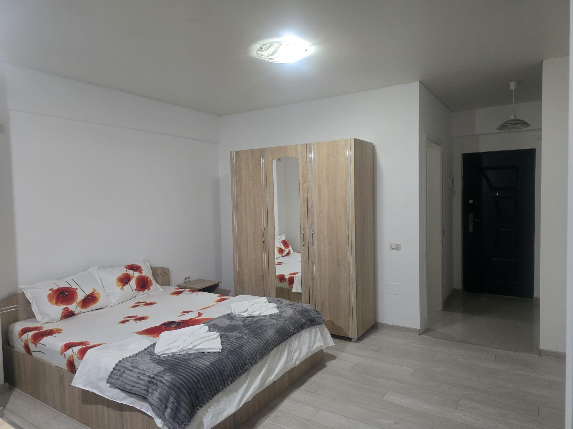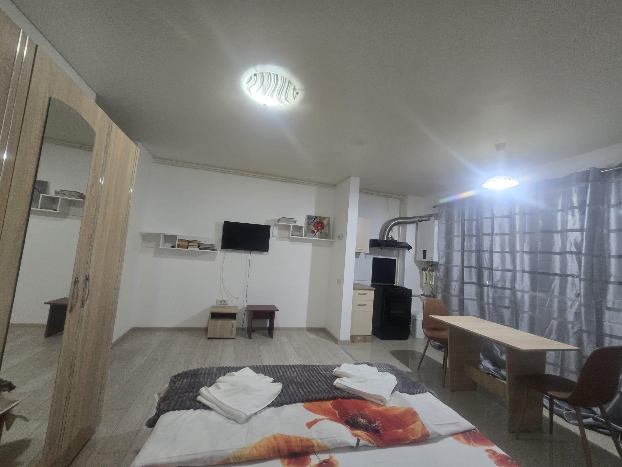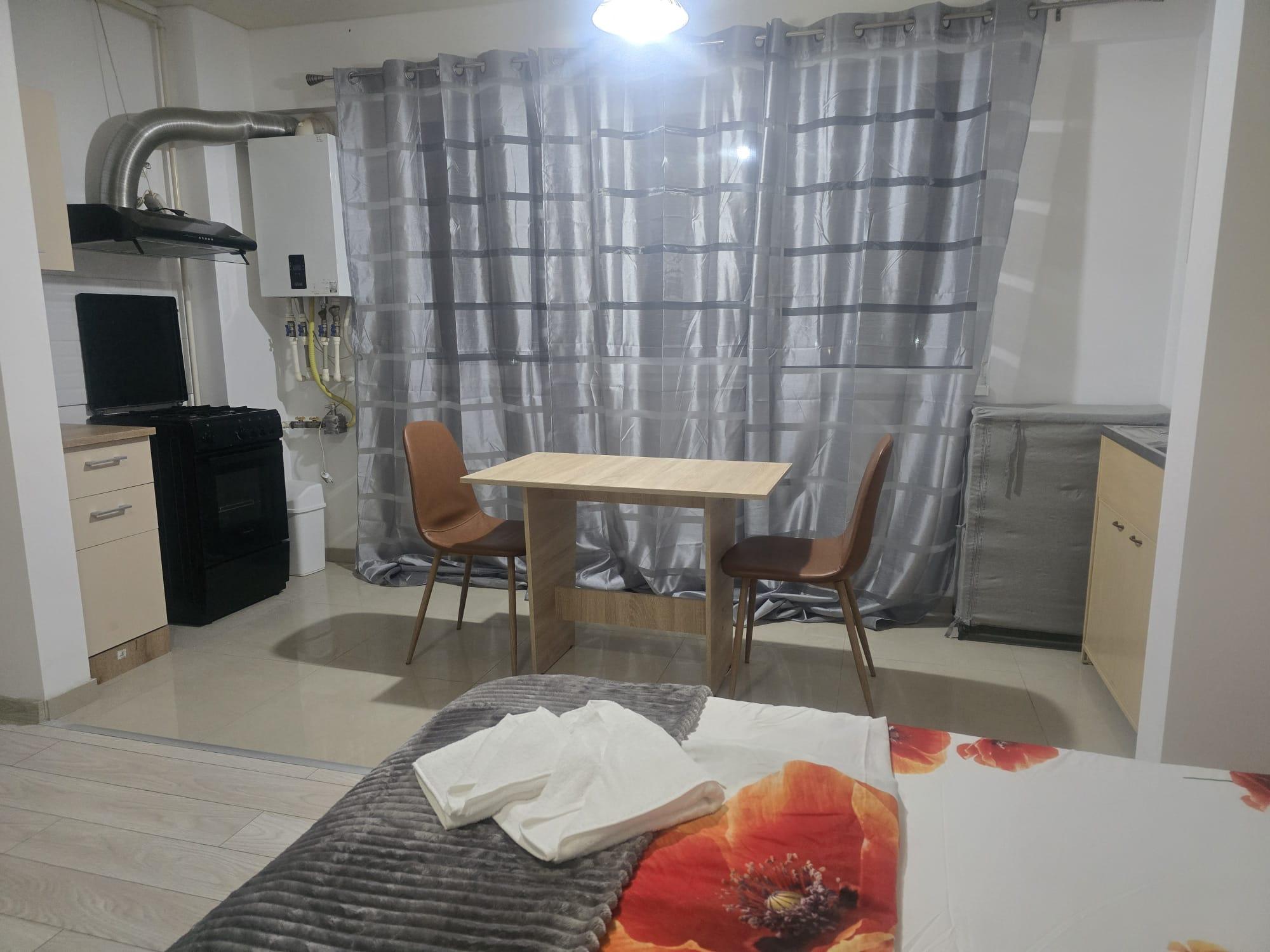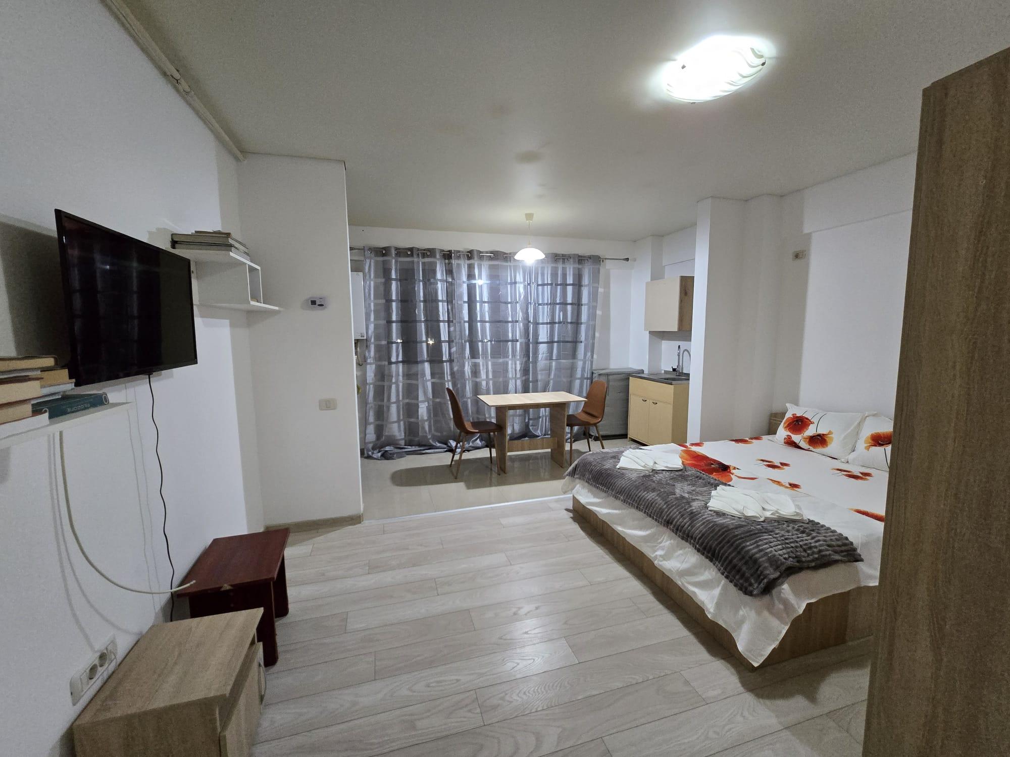 Garsoniera este semidecomandată și dispune de un spațiu deschis care include pat 160×200, TV și zonă de dining, o bucătărie utilată (frigider, aragaz cuptor cu microunde, aparat de cafea) și o baie modernă cu cada .Totul este nou!