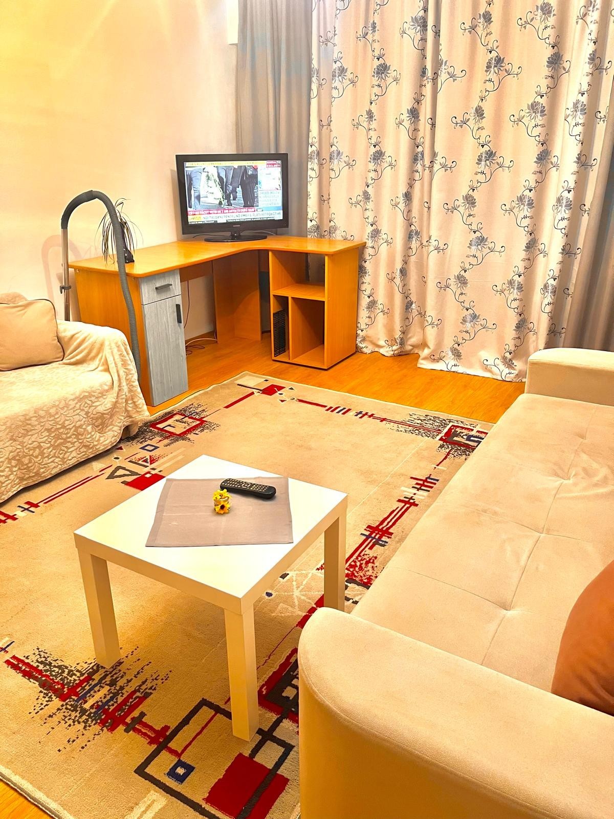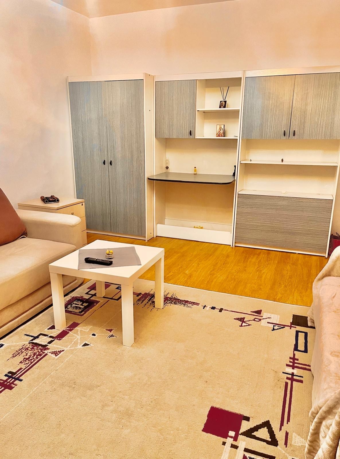 Mobila a fost conceputa in culori gri alb si bej,care ii permit locatarului sa o personalizeze dupa propriile idei si, de asemenea, canapeaua este realizata pe comanda,in functie de spatiul avut,pentru a putea sa se incadreze in perfecta armonie cu interiorul.Totodata garsoniera mai dispune si de o canapea intima ikea.Covorul ,draperiile,perdelele sunt proaspat spalate.