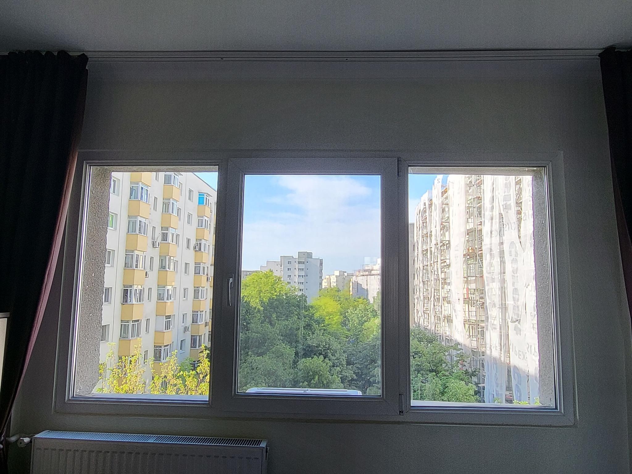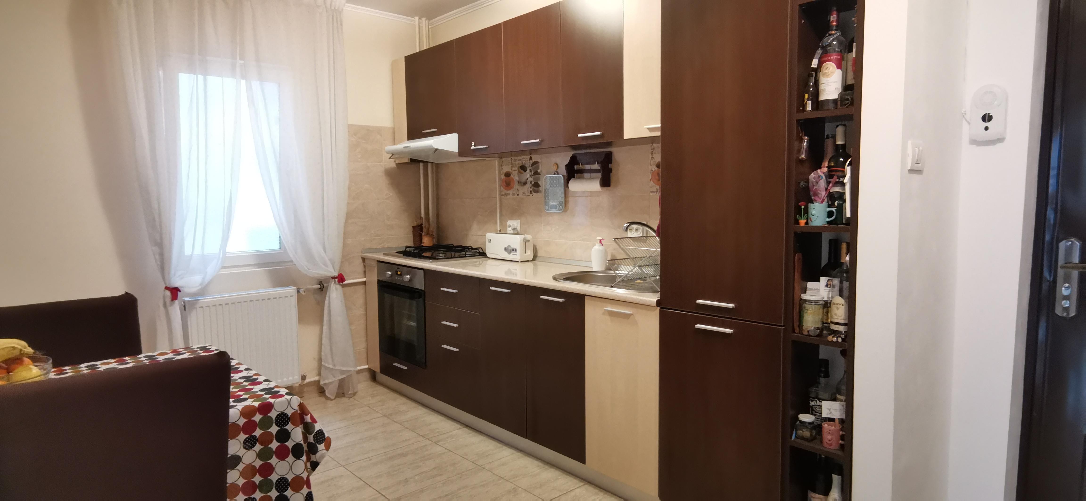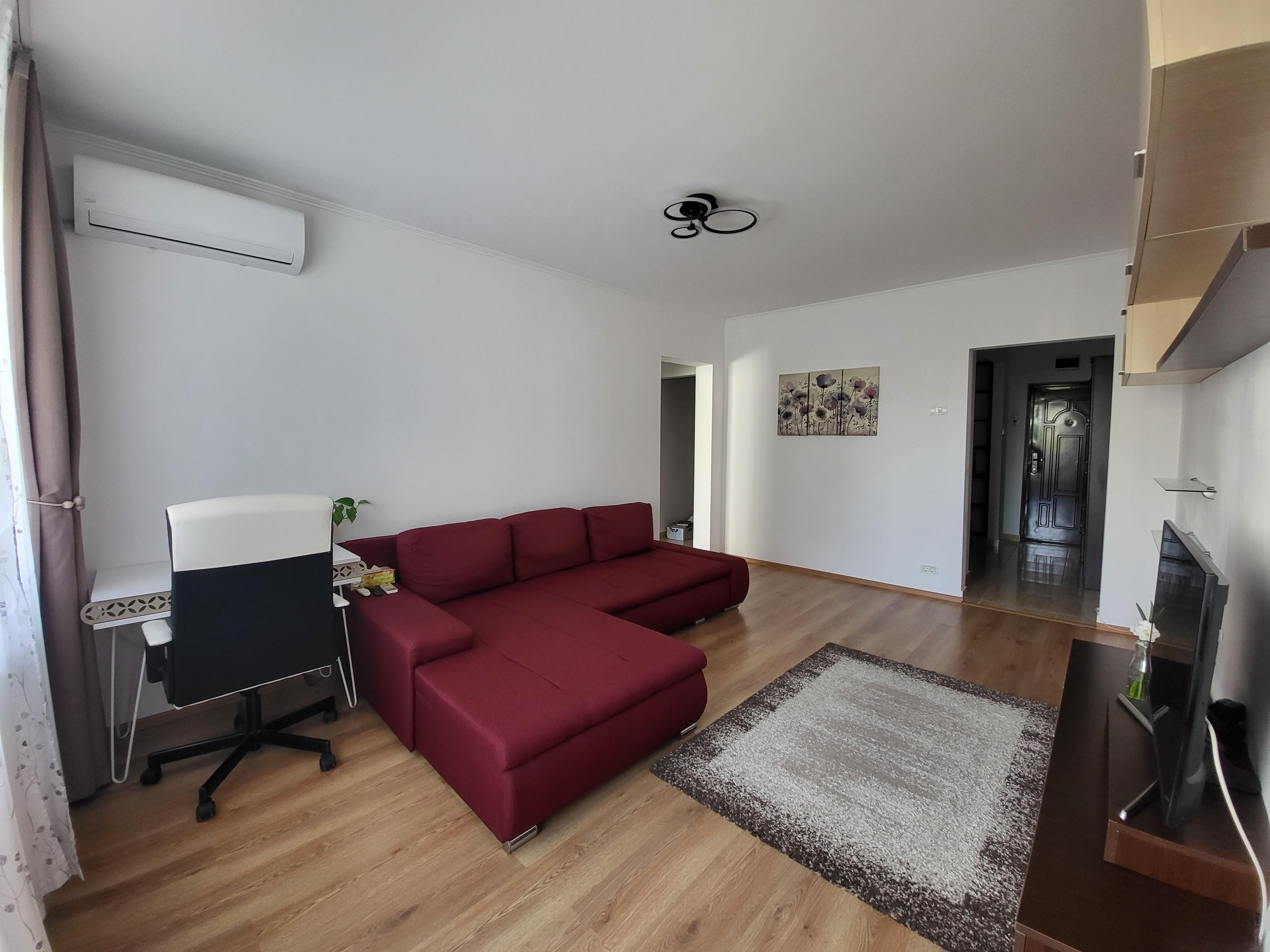 Bucataria este deschisa iar apartamentul este complet utilat si mobilat (aer conditionat, TV smart 4K, birou & scaun de birou, combina frigorifica, cuptor microunde, aspirator, masina de spalat rufe), fara loc de parcare dar cu posibilitatea de a parca in zona.