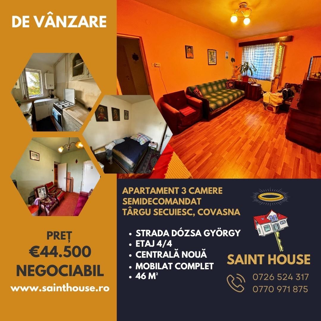 Saint House Imobiliare propune la vânzare apartament cu 3 camere semidecomandat, situat la etajul 4/4, cu suprafață utilă de 46 m², pe strada Dózsa György, mun. Târgu Secuiesc, jud. Covasna.