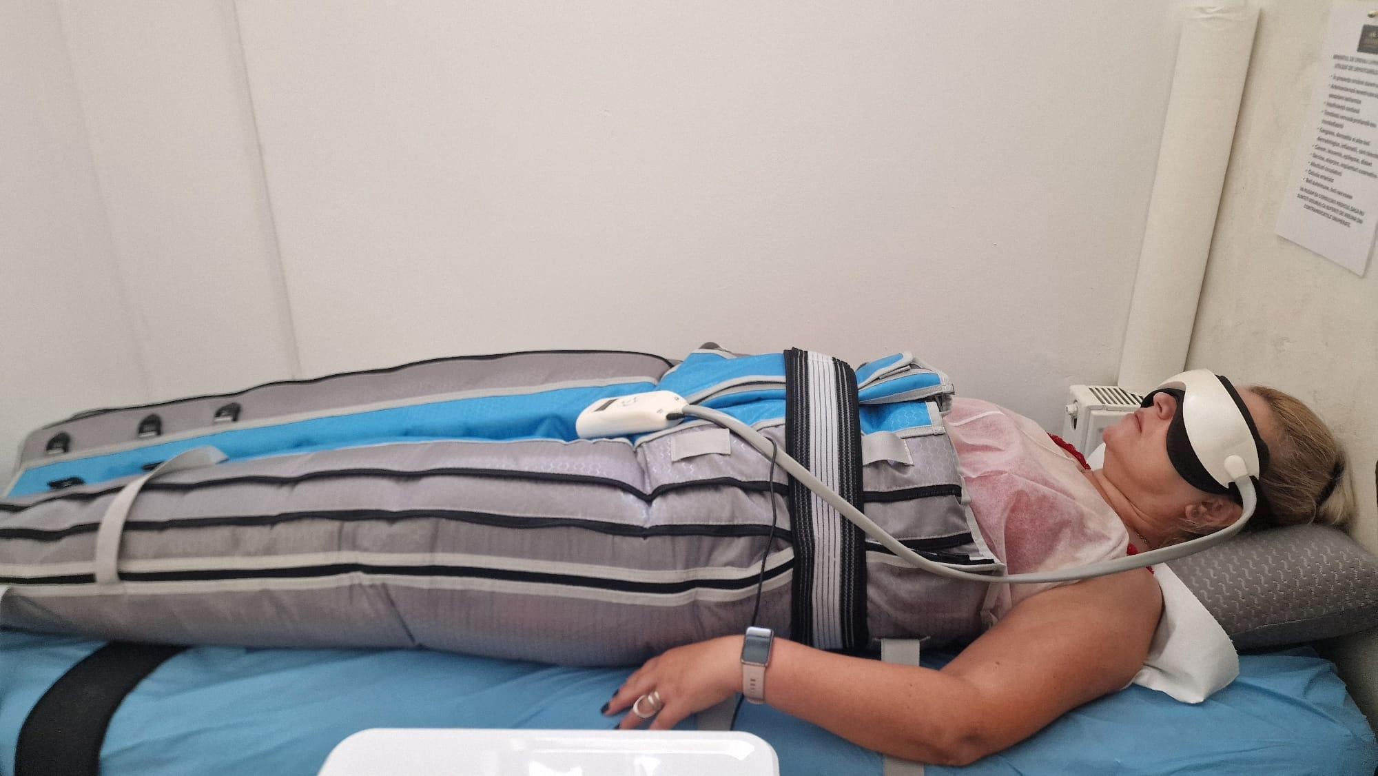 * 1 Costum pentru presodrenaj limfatic, care are atașați si o pereche de ochelari pentru masaj automat al ochilor, sinusurilor si a capului, oferind împreună maxim de relaxare și beneficiu pentru clienți.