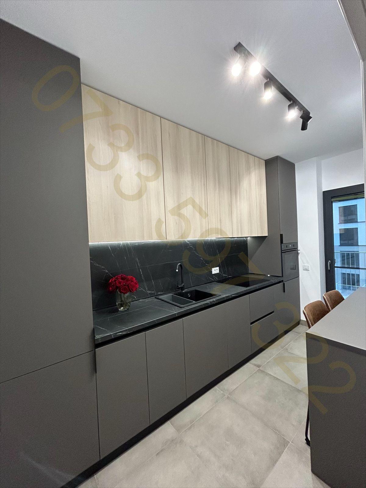• Bucătărie modernă, echipată cu mașină de spălat vase, plită electrică, cuptor electric, frigider incorporat, mobilier generos cu spații de depozitare.
