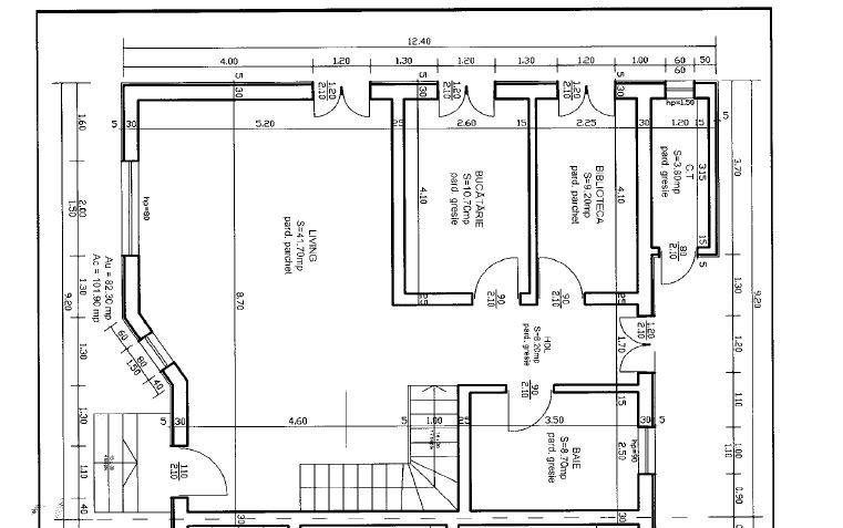 Parter: Living+Bucatarie+Birou/Biblioteca+Baie