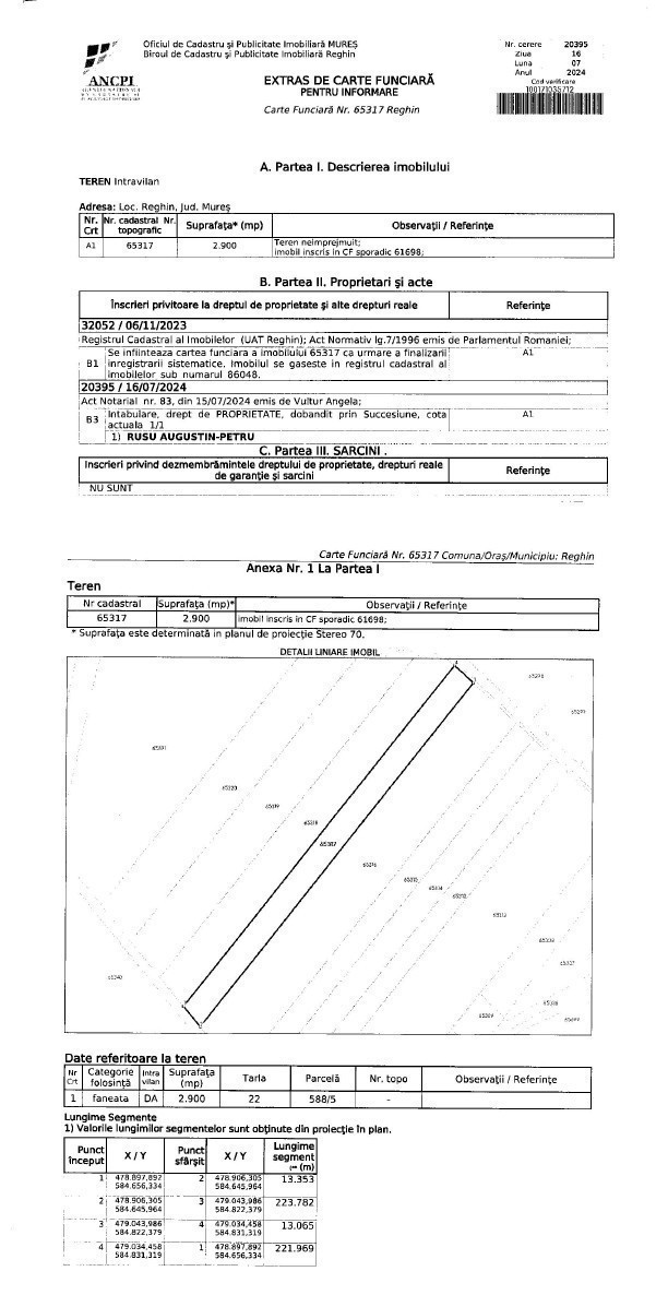 Teren Intravilan, intabulat, tip fâneața în str Gurghiului din Reghin, la aproximativ 60 m distanta de viitoarea centura ocolitoare a orașului. Terenul are o suprafața de 2900 mp si o deschidere de 13,35 m front stradal. Pret: 15 Euro /mp x 2900 mp = 43.499 Euro.