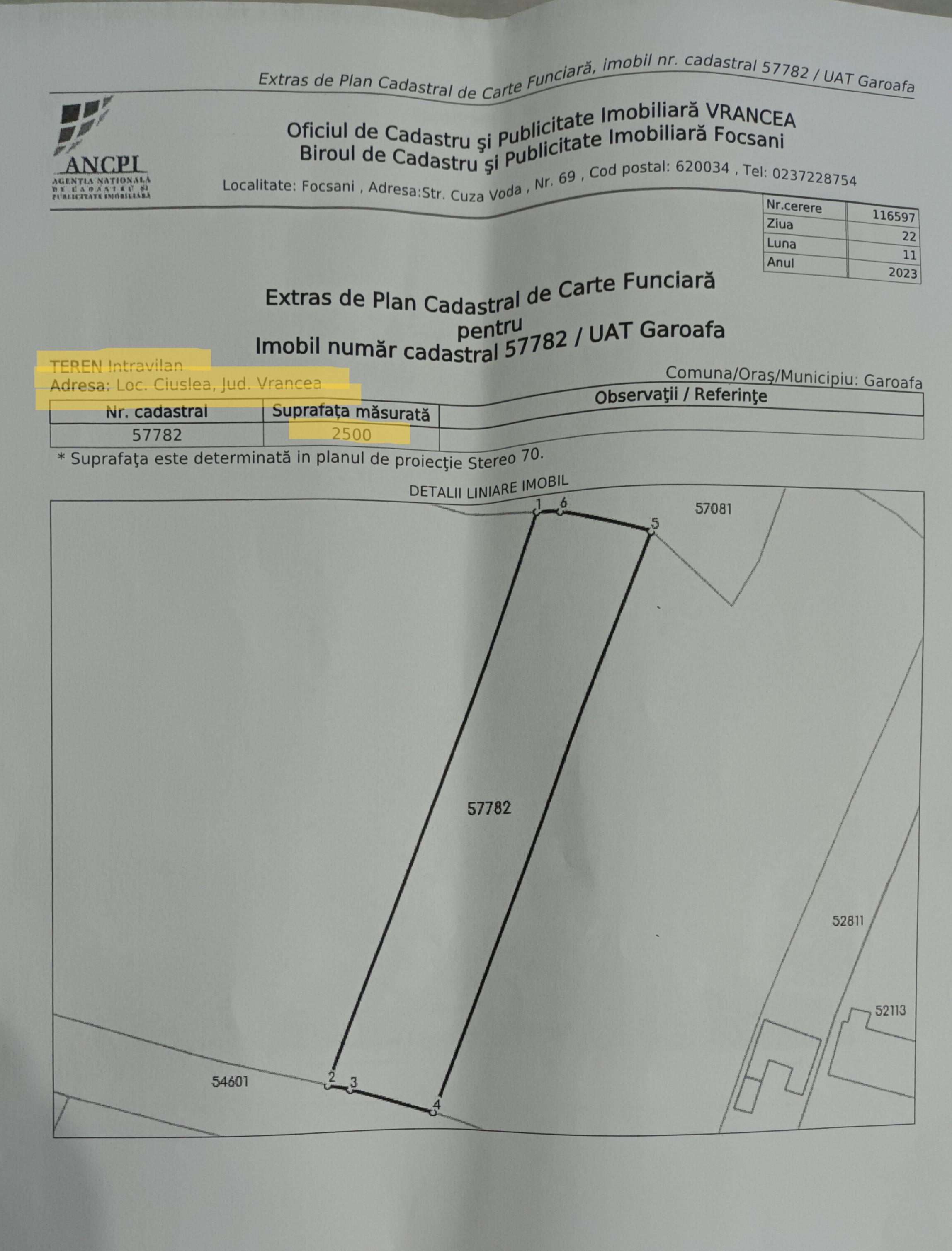 Proprietar, vand teren intravilan, loc de casa in suprafata de 2500 mp, sat Ciuslea- Comuna Garoafa, judet Vrancea
