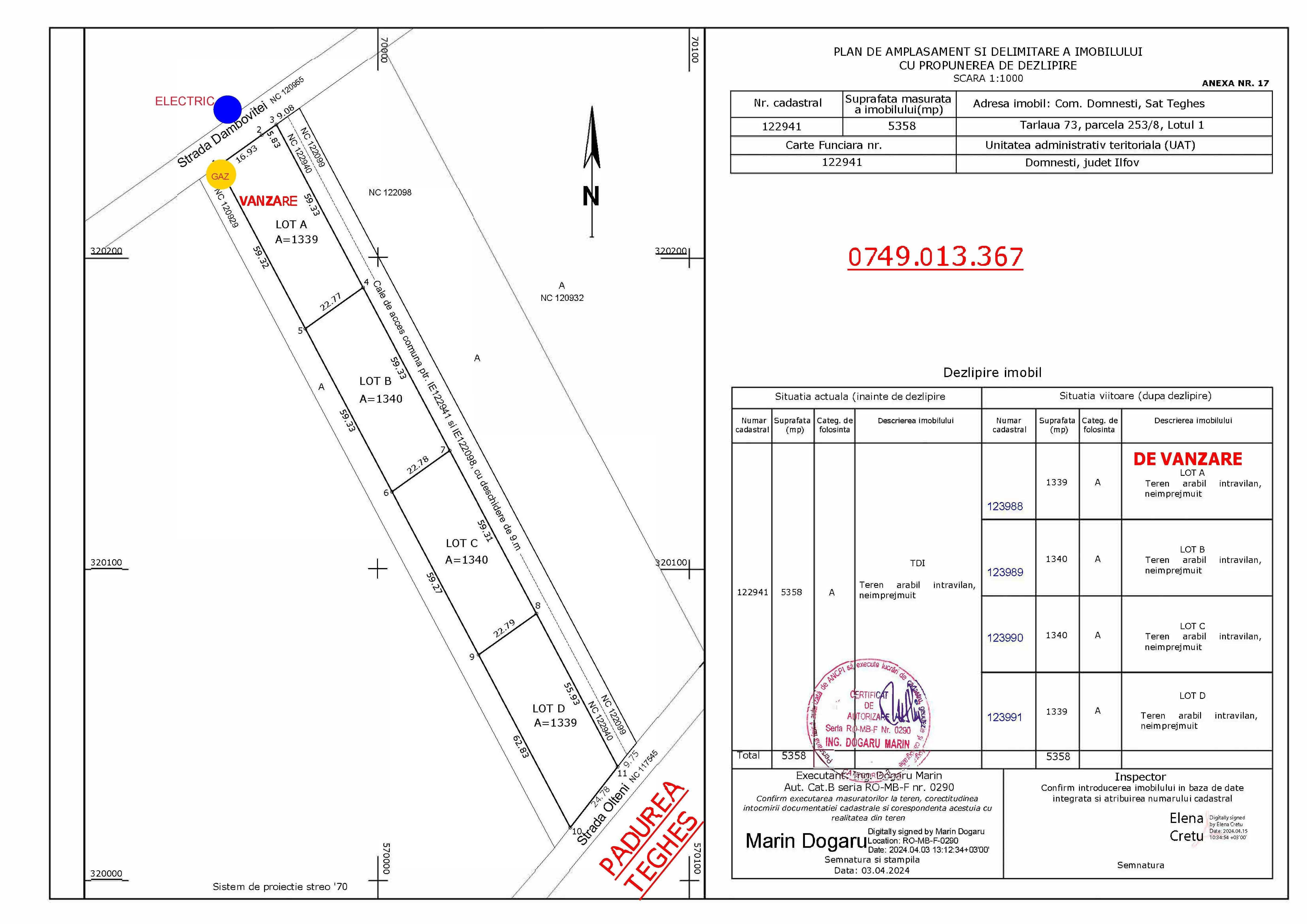 Proprietar, vand teren 1600 mp, in marginea padurii Teghes, acces dublu din str.Dambovitei la str. Olteni (padure) 40 €/mp